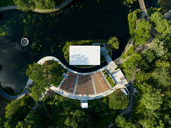 露天剧院 Théâtre de Verdure 位于 La Fontaine 公园之中,剧院建筑通过向公园开放而与周围的景观相融合,最大限度地扩大了舞台和周围绿地的视野。Lemay 的新设计从水池岸边一直延伸到公园内部,不同用途的布置方式彰显了永恒的存在感。