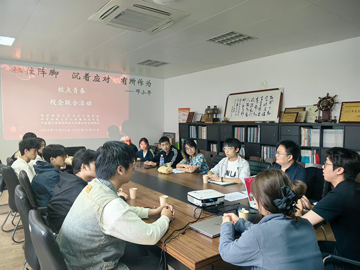 2025年10月18日,南京林业大学工程规划设计院有限公司(以下简称“设计院”)携手南京林业大学土木工程学院(以下简称“土木工程学院”)、中铁建工集团有限公司樱铁村1号生活生产房屋及院落集中整治工程项目经理部(以下简称“项目经理部”)在设计院会议室举办了“‘桩’点青春,筑梦未来”产教融合讲座活动。